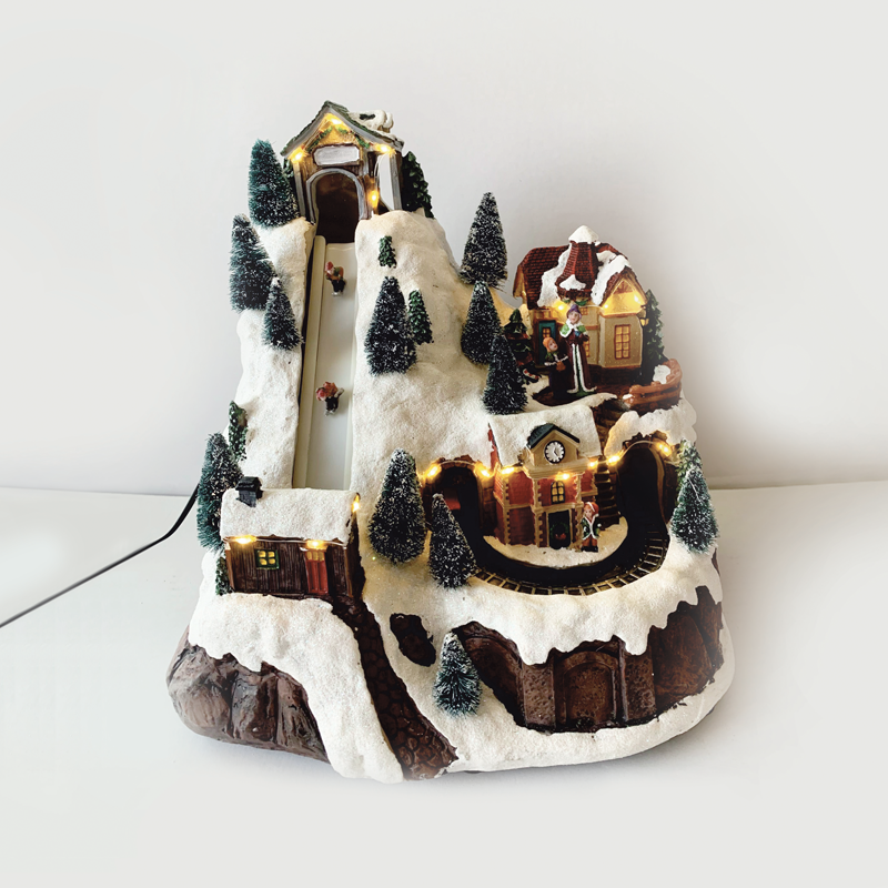 ACA Lighting X0308 LED топла светлина декор мултицветно селище + въртящ влак и ски сцена + музика 4.5V (адаптер) 3AA (бат.) 28×25.5×28.5см