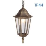 Фенер алуминиев корпус цвят античен месинг шестстенен за окачване върху таван в комплект с пендел Фасунга E27 и степен на защита IP44 общата дължина на тялото е 1100 мм Максималното натоварване е 1 х 60W за лампи с нажежаема жичка